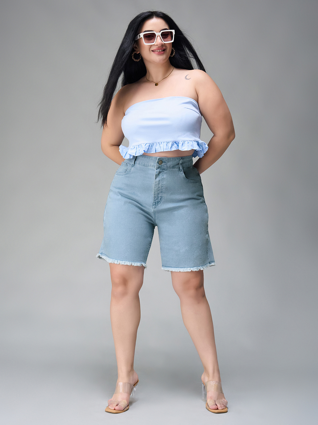 Miss Chase A+ Women's Light Blue Regular High Rise Clean Look Above Knee Stretchable Denim Shorts