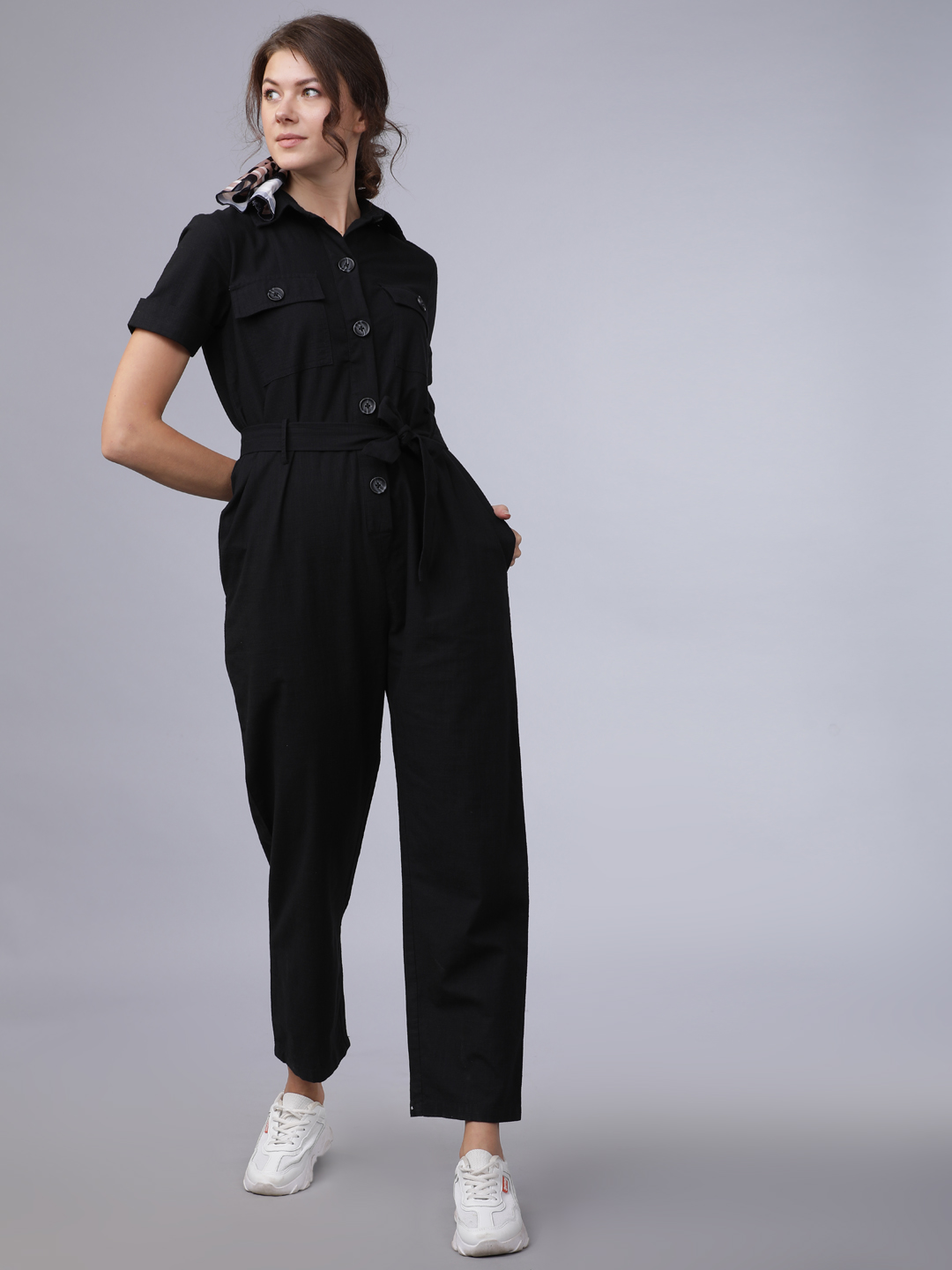 Globus Women Black Shirt Collar Waist Tie-Ups Cargo Style Wide Leg Casual Jumpsuitprice crash