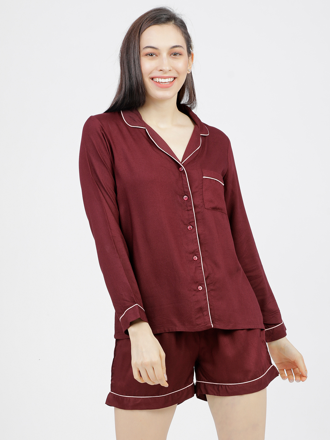 Tokyo Talkies Women Burgundy & White Night suit